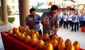 隨后鑫金山公司副總經理王總宣布積分制第一月度獲獎名單,現場為我們表現優秀的獲獎員工舉行了砸金蛋抽獎游戲環節,并準備了一等獎、二等獎、三等獎精美的獎品和雙份中秋節福利。獲獎者依次上臺砸金蛋,一件件大獎被抽走,一個個臉上洋溢著喜悅的笑容。這次快樂會議無論是臺上砸金蛋的還是臺下看著的員工們都玩的很開心。王總表示“快樂會議”旨在為了快樂,為了榮耀,讓員工歡聚在一起,在公平和相互尊重的競爭中,追求共同的快樂和超越,享受工作挑戰帶來的樂趣。鑫金山公司積分制管理快樂會議由此起步,通過雙重認可+正向引導,讓員工在積分制中體驗到有趣與感動,工作壓力得以釋放,促進員工向好、向上。